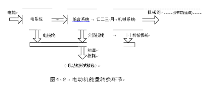 電動(dòng)機(jī)內(nèi)部實(shí)現(xiàn)能量轉(zhuǎn)換包括電系統(tǒng)、搞合系統(tǒng) 和機(jī)械系統(tǒng)三個(gè)環(huán)節(jié),如圖 1 - 2 所示 。電動(dòng)機(jī)通常是在其接線端子上輸入電能,在鈾上輸出機(jī)械功率。外電路電能通過搞合 系統(tǒng)在機(jī)械系統(tǒng)中產(chǎn)生機(jī)械能,在機(jī)械系統(tǒng)的抽頭上以機(jī)械能輸出,在上述能量轉(zhuǎn)換過程中,三個(gè)系統(tǒng)都會(huì)產(chǎn)生部分能量損失,最終都以熱能的形式向周圍環(huán)境散逸。